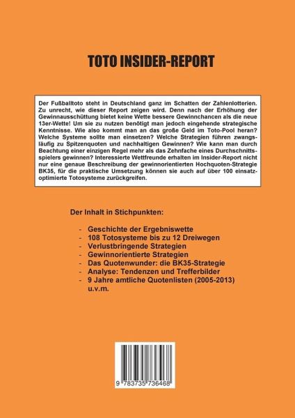 Der Fußballtoto steht in Deutschland ganz im Schatten der Zahlenlotterien. Zu unrecht, wie dieser Report zeigen wird. Denn nach einer Erhöhung der Gewinnausschüttung bietet keine Wette bessere Gewinnchancen als die neue 13er-Wette! Um diese zu nutzen benötigt man jedoch eingehende strategische Kenntnisse. Wie also kommt man an das große Geld aus dem Toto-Pool heran? Welche Systeme sollte man dafür einsetzen? Welche Strategien führen zwangsläufig zu Spitzenquoten und nachhaltigen Gewinnen? Wie kann man durch Beachtung einer einzigen Regel mehr als das Zehnfache eines Durchschnittsspielers gewinnen? Interessierte Wettfreunde erhalten im Toto Insider-Report nicht nur die genaue Beschreibung einer statistisch geprüften gewinnorientierten Hochquoten-Strategie, für die praktische Umsetzung können sie auch auf über 100 exakt berechnete, einsatzoptimierte Totosysteme zurückgreifen.