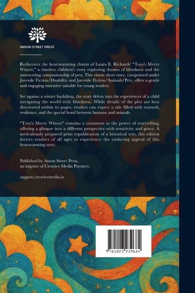 Rediscover the heartwarming charm of Laura E. Richards' "Toto's Merry Winter," a timeless children's story exploring themes of blindness and the unwavering companionship of pets. This classic short story, categorized under Juvenile Fiction/Disability and Juvenile Fiction/Animals/Pets, offers a gentle and engaging narrative suitable for young readers. Set against a winter backdrop, the story delves into the experiences of a child navigating the world with blindness. While details of the plot are best discovered within its pages, readers can expect a tale filled with warmth, resilience, and the special bond between humans and animals. "Toto's Merry Winter" remains a testament to the power of storytelling, offering a glimpse into a different perspective with sensitivity and grace. A meticulously prepared print republication of a historical text, this edition invites readers of all ages to experience the enduring appeal of this heartwarming story. This work has been selected by scholars as being culturally important, and is part of the knowledge base of civilization as we know it. This work is in the public domain in the United States of America, and possibly other nations. Within the United States, you may freely copy and distribute this work, as no entity (individual or corporate) has a copyright on the body of the work. Scholars believe, and we concur, that this work is important enough to be preserved, reproduced, and made generally available to the public. We appreciate your support of the preservation process, and thank you for being an important part of keeping this knowledge alive and relevant.