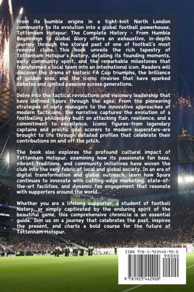 From its humble origins in a tight-knit North London community to its evolution into a global football powerhouse, Tottenham Hotspur: The Complete History - From Humble Beginnings to Global Glory offers an exhaustive, in-depth journey through the storied past of one of football's most revered clubs. This book unveils the rich tapestry of Tottenham Hotspur's history, detailing its founding moments, early community spirit, and the remarkable milestones that transformed a local team into an international icon. Readers will discover the drama of historic FA Cup triumphs, the brilliance of golden eras, and the iconic rivalries that have sparked debates and ignited passions across generations. Delve into the tactical revolutions and visionary leadership that have defined Spurs through the ages. From the pioneering strategies of early managers to the innovative approaches of modern tacticians, the narrative captures the evolution of a footballing philosophy built on attacking flair, resilience, and a commitment to excellence. Iconic figures-from legendary captains and prolific goal scorers to modern superstars-are brought to life through detailed profiles that celebrate their contributions on and off the pitch. The book also explores the profound cultural impact of Tottenham Hotspur, examining how its passionate fan base, vibrant traditions, and community initiatives have woven the club into the very fabric of local and global society. In an era of digital transformation and global outreach, learn how Spurs continues to innovate with cutting-edge marketing, state-of-the-art facilities, and dynamic fan engagement that resonate with supporters around the world. Whether you are a lifelong supporter, a student of football history, or simply captivated by the enduring spirit of the beautiful game, this comprehensive chronicle is an essential guide. Join us on a journey that celebrates the past, inspires the present, and charts a bold course for the future of Tottenham Hotspur.