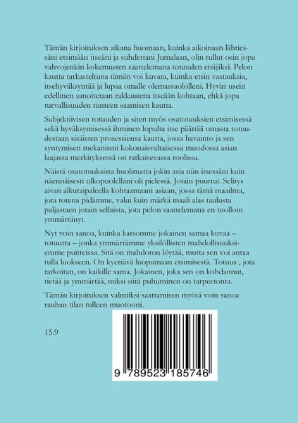 Tässä kirjoituksessa jatkan itsetutkiskelun ja siten elämänpolkuani siitä, mihin jäin kirjoituksen Aika Pimeä Energia lopussa. Tämän osamatkan aikana kohtaan totuuden, sellaisen totuuden, joka on kaikille sama. Siten on todellakin olemassa yksi totuus. Mutta kuten kaikki sen kohdanneet tietävät ja ymmärtävät, siitä puhuminen saati kirjoittaminen olisi sangen turhauttavaa yhtään suuremmassa määrin. Samoin minulle selkiintyi rakkauden olemus. Se on samalla tavalla vain yksiolemuksinen, mutta jonka ilmentäminen on riippuvainen muodosta, joka ilmentää sitä. Tuon seikan vuoksi on olemassa mitä suuremmassa määrin hyvin erilaisia rakkauden ja totuuden ilmaisuja. Tässä kirjoituksessa teen myös eräänlaista yhteenvetoa, koostetta tästä matkastani, polustani sekä elämänkokemuksistani. Minähän lähdin sirpaloituneesta dualismin maailmasta edeten kolminaisuuden kautta laajempiin kokonaisuuksiin. Näin alun Jumalan etsimiseni muotoutui itsetutkiskeluun ja edelleen oman subjektiivisen totuuden etsimisen kautta totuuden etsintään. Tuossa mainitussa totuudessa on hauska piirre. Sen löytäminen sanan klassisessa mielessä on mahdotonta, mutta sen voi antaa tulla luokseen. Kuten on sanonta, on vaikea täyttää astiaa, joka on jo täynnä. Eräs keino tyhjentää mainittu astia on kärsimyksen ja niin sanotun särkymisen kautta, toinen on esim. meditaatio ja mietiskely. On selvää, kuinka ihminen ja yksilö on tämä mainittu astia.