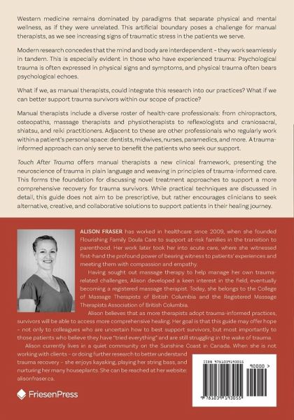 Alison Fraser has worked in healthcare since 2009, when she founded Flourishing Family Doula Care to support at-risk families in the transition to parenthood. Her work later took her into acute care, where she witnessed first-hand the profound power of bearing witness to patients' experiences and meeting them with compassion and empathy. Having sought out massage therapy to help manage her own trauma-related challenges, Alison developed a keen interest in the field, eventually becoming a registered massage therapist. Today, she belongs to the College of Massage Therapists of British Columbia and the Registered Massage Therapists Association of British Columbia. Alison believes that as more therapists adopt trauma-informed practices, survivors will be able to access more comprehensive healing. Her goal is that this guide may offer hope - not only to colleagues who are uncertain how to best support survivors, but most importantly to those patients who believe they have "tried everything" and are still struggling in the wake of trauma. Alison currently lives in a quiet community on the Sunshine Coast in Canada. When she is not working with clients - or doing further research to better understand trauma recovery - she enjoys kayaking, playing her string bass, and nurturing her many houseplants. She can be reached at her website: alisonfraser.ca