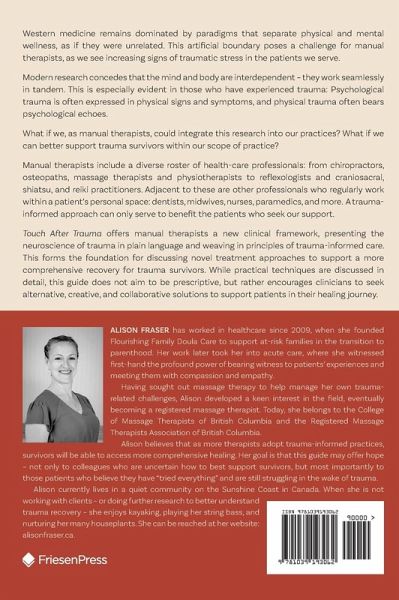 Alison Fraser has worked in healthcare since 2009, when she founded Flourishing Family Doula Care to support at-risk families in the transition to parenthood. Her work later took her into acute care, where she witnessed first-hand the profound power of bearing witness to patients' experiences and meeting them with compassion and empathy. Having sought out massage therapy to help manage her own trauma-related challenges, Alison developed a keen interest in the field, eventually becoming a registered massage therapist. Today, she belongs to the College of Massage Therapists of British Columbia and the Registered Massage Therapists Association of British Columbia. Alison believes that as more therapists adopt trauma-informed practices, survivors will be able to access more comprehensive healing. Her goal is that this guide may offer hope - not only to colleagues who are uncertain how to best support survivors, but most importantly to those patients who believe they have "tried everything" and are still struggling in the wake of trauma. Alison currently lives in a quiet community on the Sunshine Coast in Canada. When she is not working with clients - or doing further research to better understand trauma recovery - she enjoys kayaking, playing her string bass, and nurturing her many houseplants. She can be reached at her website: alisonfraser.ca