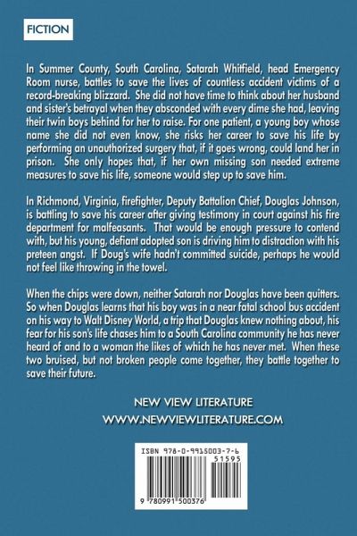 In Summer County, South Carolina, Satarah Whitfield, head Emergency Room nurse, battles to save the lives of countless accident victims of a record-break blizzard. She did not have time to think about her husband's and sister's betrayal when they absconded with every dime she had, leaving their twin boys behind for her to raise. For one patient, a young boy whose name she did not even know, she risks her career to save his life by performing an unauthorized surgery that, if it goes wrong, could land her in prison. She only hopes that, if her own missing son needed extreme measures to save his life, someone would step up to save him. In Richmond, Virginia, firefighter, Deputy Battalion Chief, Douglas Johnson, is battling to save his career after giving testimony in court against his fire department for malfeasants. That would be enough pressure to contend with, but his young, defiant adopted son is driving him to distraction with his preteen angst. If Doug's wife hadn't committed suicide, perhaps he would not feel like throwing in the towel. When the chips were down, neither Satarah nor Douglas have been quitters. So when Douglas learns that his boy was in a near fatal school bus accident on his way to Walt Disney World, a trip that Douglas knew nothing about, his fear for his son's life chases him to a South Carolina community he has never heard of and to a woman the likes of which he has never met. When these two bruised, but not broken people come together, they battle together to save their future.