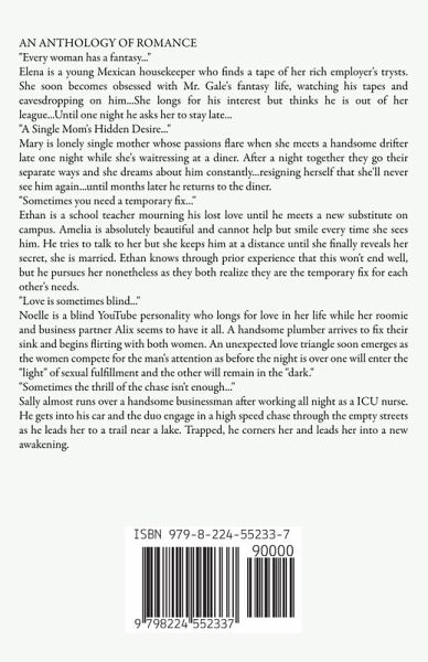 AN ANTHOLOGY OF ROMANCE "Every woman has a fantasy..." Elena is a young Mexican housekeeper who finds a tape of her rich employer's trysts. She soon becomes obsessed with Mr. Gale's fantasy life, watching his tapes and eavesdropping on him...She longs for his interest but thinks he is out of her league...Until one night he asks her to stay late... "A Single Mom's Hidden Desire..." Mary is lonely single mother whose passions flare when she meets a handsome drifter late one night while she's waitressing at a diner. After a night together they go their separate ways and she dreams about him constantly...resigning herself that she'll never see him again...until months later he returns to the diner. "Sometimes you need a temporary fix..." Ethan is a school teacher mourning his lost love until he meets a new substitute on campus. Amelia is absolutely beautiful and cannot help but smile every time she sees him. He tries to talk to her but she keeps him at a distance until she finally reveals her secret, she is married. Ethan knows through prior experience that this won't end well, but he pursues her nonetheless as they both realize they are the temporary fix for each other's needs. "Love is sometimes blind..." Noelle is a blind YouTube personality who longs for love in her life while her roomie and business partner Alix seems to have it all. A handsome plumber arrives to fix their sink and begins flirting with both women. An unexpected love triangle soon emerges as the women compete for the man's attention as before the night is over one will enter the "light" of sexual fulfillment and the other will remain in the "dark." "Sometimes the thrill of the chase isn't enough..." Sally almost runs over a handsome businessman after working all night as a ICU nurse. He gets into his car and the duo engage in a high speed chase through the empty streets as he leads her to a trail near a lake. Trapped, he corners her and leads her into a new awakening.