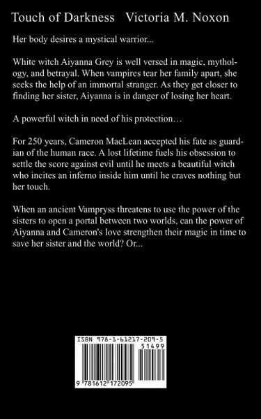 Her body desires a mystical warrior... White witch Aiyanna Grey is well versed in magic, mythology, and betrayal. When vampires tear her family apart, she seeks the help of an immortal stranger. As they get closer to finding her sister, Aiyanna is in danger of losing her heart. A powerful witch in need of his protection-- For 250 years, Cameron MacLean accepted his fate as guardian of the human race. A lost lifetime fuels his obsession to settle the score against evil until he meets a beautiful witch who incites an inferno inside him until he craves nothing but her touch. When an ancient Vampryss threatens to use the power of the sisters to open a portal between two worlds, can the power of Aiyanna and Cameron's love strengthen their magic in time to save her sister and the world? Or...