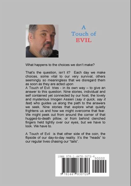 Nine short stories that explore the effect of random chance on the lives of ordinary people.A Touch of Evil offers an answer to the eternal question: "What if?" Inspired by the work of Rod Serling in his seminal television series 'The Twilight Zone'&'Night Gallery',as well as 'The Outer Limits' & 'Twisted Tales', Touch of Evil poses questions,then offers possible answers that take the reader along pathways they may not wish to travel. For example: every day you follow a particular path in your life.But what happens when one tiny,but significant detail is changed-by fate,chance or just plain Luck? You fall asleep on a train & end up...where? That shortcut you're thinking of taking? You may not end up where you think you're going to & be careful of boxed chocolates delivered when you're not expecting them. Inside these pages you'll find things you take for granted in every day life turned ninety degrees. Just because it looks the same never means it is. A Touch of Evil. Just a tiny touch. Enjoy.