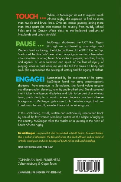 South Africa is a land of contrasts, as the tourist brochures promise, and this is true for the game of rugby. From the Pretoria heartland to the aspirant Eastern Cape, from the hardscrabble Cape Flats to the islands of privilege at Bishops and Grey College. No other rugby-playing nation has to grapple with so much diversity. Different languages, classes, races and cultures - each bearing the wounds of the country's fractured past - have to be melded into winning teams. Liz McGregor has spent the past three years shadowing Currie Cup, Super 14 and Springbok teams across the country, and has come to the conclusion that it is this very diversity, combined with the pain of the past and the dreams of a great united future, that provide the elusive alchemy that separates a good team from a great one. Touch, Pause, Engage! is more than a book about rugby. It is an intimate look at how South Africa's erstwhile elite is adapting to its new circumstances. Team South Africa has been through many a maul and bruising scrum, but is inching closer and closer to the tryline.