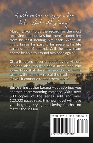 A wide receiver, an injury, a team doctor. What could go wrong? Mason Dixon holds the record for the most receiving touchdowns but there's something from his past holding him back. When an injury brings his past to his present, his life careens out of control. Will the new team doctor be able to ground him once again? Clara Bradford never stopped loving Mason, but she also thought she'd never see him again. Now that she's the new doctor on his team, will she finally reveal the truth to him? Or will it continue to tear them apart? Fans of Susan May Warren, Melissa McClone, and Dale Mayer will love this heart-warming romance from best-selling author Lorana Hoopes. With over 500 copies of the series sold and over 120,000 pages read, this new novel will have you laughing, crying, and loving football no matter the season. Grab your copy today by clicking above.