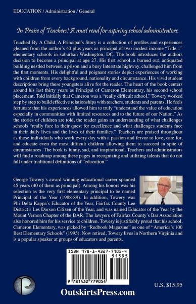 Touched By A Child, A Principal's Story, is a collection of stories and experiences about the author's 40 years as principal of two modest income, "Title 1" elementary schools in suburban Washington, DC. The book begins with why the author became a teacher followed by his first experience as principal at age 27 in a burned out, antiquated school building next to a prison and an Interstate highway. The heart of the book is based on his last thirty years as principal of a second school to which he was introduced as a "really difficult school." Through experience, the author grew to truly understand the value of education especially in communities with limited resources and to the future of our Nation. As the stories of children are told, the reader gains an understanding of what challenges schools "really" face in their quest for excellence and what challenges students face in their daily lives and the lives of their families. Teachers are praised throughout as those individuals who work every day with a passion and fervor to love, care for and educate even the most difficult children who, thanks to teachers, succeed in spite of circumstance. The book is funny, sad and inspirational as the reader learns about "The School with a Barnyard", "Po-Verty", "A Little United Nations" and "Alternative Education" (classes for those whose behavior is such that they could not function in a regular school situation). The book also relates the many duties of school administrators and teachers that do not fall under what we normally regard as education.