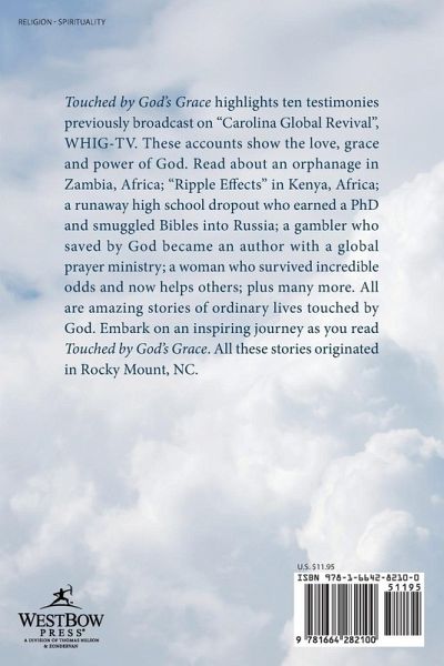 Touched by God's Grace highlights ten testimonies previously broadcast on "Carolina Global Revival", WHIG-TV. These accounts show the love, grace and power of God. Read about an orphanage in Zambia, Africa; "Ripple Effects" in Kenya, Africa; a runaway high school dropout who earned a PhD and smuggled Bibles into Russia; a gambler who saved by God became an author with a global prayer ministry; a woman who survived incredible odds and now helps others; plus many more. All are amazing stories of ordinary lives touched by God. Embark on an inspiring journey as you read Touched by God's Grace. All these stories originated in Rocky Mount, NC.