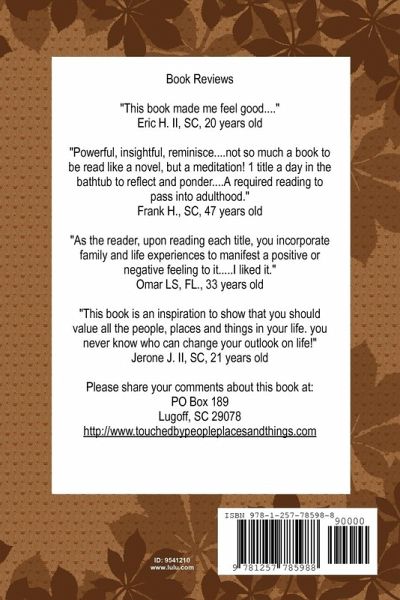 A book about how our lives are shaped by people, places and things...a feel good book....laugh, smile and remember life's experiences.