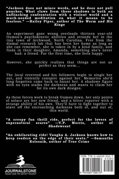 An experiment gone wrong overloads thirteen year-old Oumou's psychokinetic abilities and strands her in the tiny town of Archwood, North Carolina. Free from the dismal research lab that has been her home as long as she can remember, she is taken in by a kind family, and finds in their daughter, Amanda, something she's never had: a friend. For the first time, she feels happy. However, she quickly realizes that things are not as perfect as they seem... The local reverend and his followers begin to single her out, and violently conspire against her. Memories she'd long forgotten come back to haunt her. A shadowy figure with no eyes stalks the darkness and wants to claim her for its own dark designs. As these forces work to break Oumou down, her only points of solace are her new friend, and a bitter reporter with a strange ability of his own. They'll have to fight together to stave off the encroaching darkness both of, and out of, this world. "Jackson does not mince words, and he does not pull punches. What claws from these shadows is both an unflinching confrontation with a violent world and a much-needed meditation on what it means to be fearless." - Hailey Piper, author of The Worm and His Kings "A creepy fun thrill ride, perfect for the lovers of supernatural scares" -V.P. Morris, author of Shadowcast "An exhilarating ride! Vaughn A. Jackson knows how to keep readers on the edge of their seats." - Samantha Kolesnik, author of True Crime