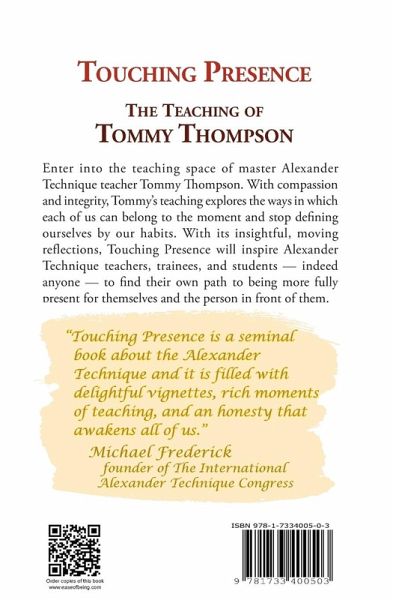 Enter into the teaching space of master Alexander Technique teacher Tommy Thompson. With compassion and integrity, Tommy’s teaching explores the ways in which each of us can belong to the moment and stop defining ourselves by our habits. With its insightful, moving reflections, Touching Presence will inspire Alexander Technique teachers, trainees, and students — indeed anyone — to find their own path to being more fully present for themselves and the person in front of them.