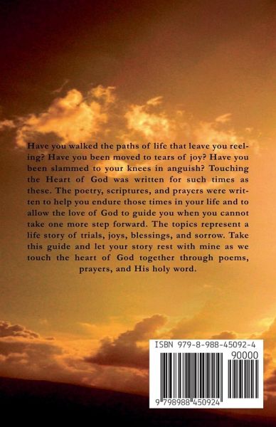 Have you searched for ways to grow your faith? Have you walked the paths of life that leave you reeling? Have you been moved to tears of joy? Have you been slammed to your knees in anguish? Touching the Heart of God was written for such times as these. The poetry, scriptures, and prayers were written to help you endure those times in your life and to allow the love of God to guide you when you cannot take one more step forward. The topics represent a life story of trials, joys, blessings, and sorrow. Take this guide and let your story rest with mine as we touch the heart of God together through poems, prayers, and His holy word.