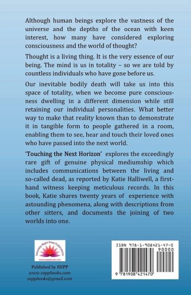 'Touching the Next Horizon' explores the exceedingly rare gift of genuine physical mediumship through the UK medium Stewart Alexander which includes communications between the living and so-called dead, as reported by Katie Halliwell, a first-hand witness who has kept meticulous records. Detailing 20 years of the author's experiences with the 'Stewart Alexander Circle' it contains the best of her original trilogy and further interesting reports of trance and physical phenomena up to 2019. Katie includes the results of the tragic passing of a prominent circle member and the death of a much-loved friend of the circle and his 'return' to speak to a friend and later materialize to hold his wife's hand. Also in the book are fine detailed illustrations depicting physical phenomena in action, as Katie takes us into the séance room. The interesting account of the traditional Christmas tree séance which the Alexander Circle gave in 2006 is included with a report on the evident joy of the sitters as the Spirit children played with the toys provided. New information from the spirit team clarifies the different energy needed for the matter-thru-matter experiment and we read of new steps in developing transfiguration which brings us up to date. These are just some of the wonders within this new edition as it seeks to demonstrate and prove survival after death and how it is all made possible by the blending of the two worlds through the physical mediumship of Stewart Alexander.