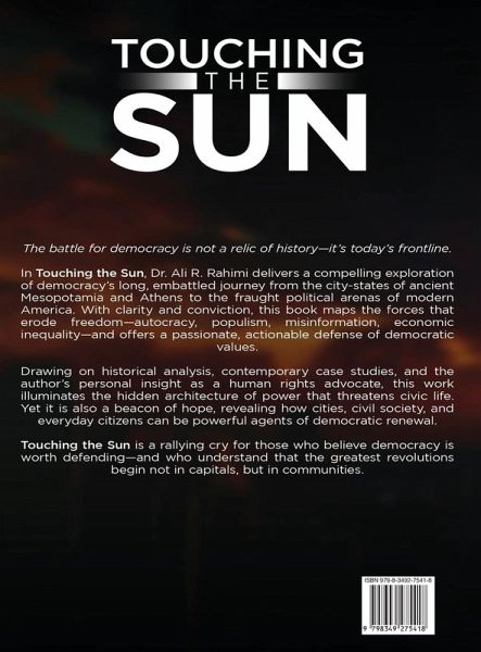 In Touching the Sun, Dr. Ali R. Rahimi delivers a compelling exploration of democracy's long, embattled journey from the city-states of ancient Mesopotamia and Athens to the fraught political arenas of modern America. With clarity and conviction, this book maps the forces that erode freedom-autocracy, populism, misinformation, economic inequality-and offers a passionate, actionable defense of democratic values. Drawing on historical analysis, contemporary case studies, and the author's personal insight as a human rights advocate, this work illuminates the hidden architecture of power that threatens civic life. Yet it is also a beacon of hope, revealing how cities, civil society, and everyday citizens can be powerful agents of democratic renewal. Touching the Sun is a rallying cry for those who believe democracy is worth defending-and who understand that the greatest revolutions begin not in capitals, but in communities.