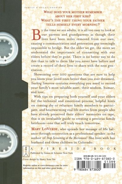 WHAT DOES YOUR MOTHER REMEMBER ABOUT HER FIRST KISS? WHAT'S THE FIRST THING YOUR FATHER TELLS HIMSELF EVERY MORNING? By the time we are adults, it is all too easy to look at our parents and grandparents as though their lives have been miles removed from our own, causing a communication and generation gap seemingly impossible to bridge. But the older we get, the more we understand the importance of connecting with our elders before they're gone. There is no better way to do this than to talk to them like you never have before and create a record of their lives to share with the next generation. Showcasing over 200 questions that are sure to help you know your loved ones better than you ever dreamed, Touching Tomorrow contains everything you need to record your family's most valuable asset: their wisdom, humor, and love. With tips on preparing both yourself and your elders for the technical and emotional process, helpful hints on coaxing shy or reluctant family members to participate, and heartwarming real life stories from people who have already preserved their elders' memories on tape, this is an invaluable guide to creating a precious family heirloom -- one that will truly touch tomorrow.