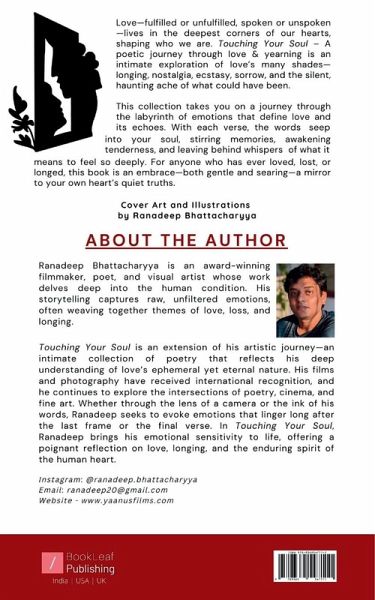 "Ranadeep Bhattacharyya is an award-winning filmmaker, poet, and visual artistwhose work delves deep into the human condition. His storytelling captures raw,unfiltered emotions, often weaving together themes of love, loss, and longing.Touching Your Soul is an extension of his artistic journey-an intimate collection ofpoetry that reflects his deep understanding of love's ephemeral yet eternal nature. In Touching Your Soul, Ranadeep brings his emotional sensitivity to life, offering a poignant reflection on love, longing, and the enduring spirit of the human heart."