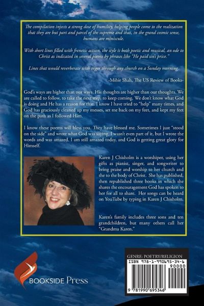 The compilation injects a strong dose of humility, helping people come to the realization that they are but part and parcel of the supreme and that, in the grand cosmic sense, humans are miniscule. With short lines filled with frenetic action, the style is both poetic and musical, an ode to Christ as indicated in several poems by phrases like "He paid sin's price." Lines that would reverberate with vigor through any church on a Sunday morning.-Mihir Shah, The US Review of Books- God's ways are higher than our ways. His thoughts are higher than our thoughts. We are called to follow, to take the next step, to keep coming. We don't know what God is doing and He has a reason for that. I know I have tried to "help" many times, and God has graciously cleaned up my messes, set me back on my feet, and kept my feet on the path as I followed Him. I know these poems will bless you. They have blessed me. Sometimes I just "stood on the side" and wrote what God was saying. I wasn't even part of it, but I wrote the words and was amazed. I am still amazed today, and God is getting great glory for Himself.