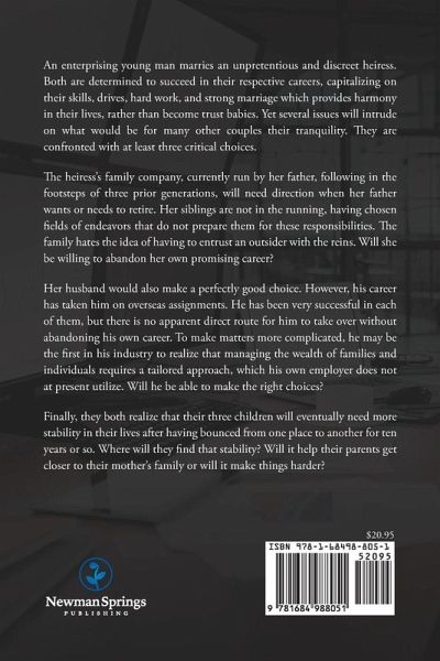 An enterprising young man marries an unpretentious and discreet heiress. Both are determined to succeed in their respective careers, capitalizing on their skills, drives, hard work, and strong marriage which provides harmony in their lives, rather than become trust babies. Yet several issues will intrude on what would be for many other couples their tranquility. They are confronted with at least three critical choices. The heiress's family company, currently run by her father, following in the footsteps of three prior generations, will need direction when her father wants or needs to retire. Her siblings are not in the running, having chosen fields of endeavors that do not prepare them for these responsibilities. The family hates the idea of having to entrust an outsider with the reins. Will she be willing to abandon her own promising career? Her husband would also make a perfectly good choice. However, his career has taken him on overseas assignments. He has been very successful in each of them, but there is no apparent direct route for him to take over without abandoning his own career. To make matters more complicated, he may be the first in his industry to realize that managing the wealth of families and individuals requires a tailored approach, which his own employer does not at present utilize. Will he be able to make the right choices? Finally, they both realize that their three children will eventually need more stability in their lives after having bounced from one place to another for ten years or so. Where will they find that stability? Will it help their parents get closer to their mother's family or will it make things harder?