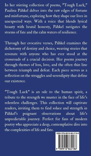 In her stirring collection of poems, "Tough Luck," Paulina Pähkel delves into the raw edges of fortune and misfortune, exploring how they shape our lives in unexpected ways. With a voice that blends lyrical beauty with brutal honesty, Pähkel navigates the storms of fate and the calm waters of resilience. Through her evocative verses, Pähkel examines the dichotomy of destiny and choice, weaving stories that resonate with anyone who has ever stood at the crossroads of a crucial decision. Her poems journey through themes of loss, love, and the often thin line between triumph and defeat. Each piece serves as a reflection on the struggles and serendipity that define our existence. "Tough Luck" is an ode to the human spirit, a tribute to the strength we muster in the face of life's relentless challenges. This collection will captivate readers, inviting them to find solace and strength in Pähkel's poignant observations about life's unpredictable journey. Perfect for fans of modern poetry who appreciate a deep, contemplative dive into the complexities of life and fate. Copyright (c) 2024 Swan Charm Publishing
