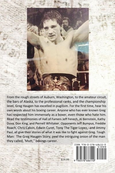 From the rough streets of Auburn, Washington, to the amateur circuit, the bars of Alaska, to the professional ranks, and the championship level, Greg Haugen has excelled in pugilism. For the first time, hear his own words about his boxing career. Anyone who has ever known Greg has respected him immensely as a boxer, even those who hate him. Read the testimonies of Hall of Famers Jeff Fenech, Al Bernstein, Kathy Duva, Don King, and Pernell Whitaker. Opponents Jeff Bumpus, Freddie Roach, Chris Calvin, Edwin Curet, Tony The Tiger Lopez, and Jimmy Paul, all give their stories of what it was like to fight against Greg. Tough Man: The Greg Haugen Story, peel the intriguing onion of the man they called, 'Mutt," boxings career.