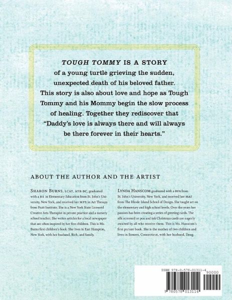 Tough Tommy is a story of a young turtle grieving the sudden, unexpected death of his beloved father. This story is also about love and hope as Tough Tommy and his Mommy begin the slow process of healing. This sensitively written story by Art Therapist, Sharon Burns, will provide a vehicle for families,therapists,educators and others to deal will the difficult topic of the loss of a loved one. The beautiful illustrations by Lynda Hanscom, enhance the story and engage the reader. Activity sheets for individual or classroom use are included at the end of the book.