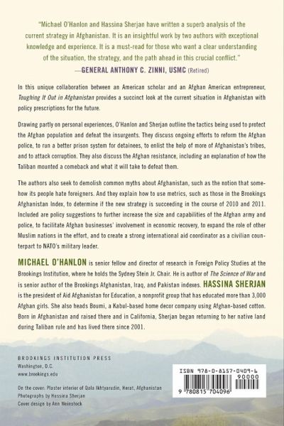 " ""Michael O'Hanlon and Hassina Sherjan have written a superb analysis of the current strategy in Afghanistan. It is an insightful work by two authors with exceptional knowledge and experience. It is a must-read for those who want a clear understanding of the situation, the strategy, and the path ahead in this crucial conflict."" -General Anthony C. Zinni, USMC (Retired) In this unique collaboration between an American scholar and an Afghan American entrepreneur, Toughing It Out in Afghanistan provides a succinct look at the current situation in Afghanistan with policy prescriptions for the future. Drawing partly on personal experiences, O'Hanlon and Sherjan outline the tactics being used to protect the Afghan population and defeat the insurgents. They discuss ongoing efforts to reform the Afghan police, to run a better prison system for detainees, to enlist the help of more of Afghanistan's tribes, and to attack corruption. They also discuss the Afghan resistance, including an explanation of how the Taliban mounted a comeback and what it will take to defeat them. The authors also seek to demolish common myths about Afghanistan, such as the notion that somehow its people hate foreigners. And they explain how to use metrics, such as those in the Brookings Afghanistan Index, to determine if the new strategy is succeeding in the course of 2010 and 2011. Included are policy suggestions to further increase the size and capabilities of the Afghan army and police, to facilitate Afghan businesses' involvement in economic recovery, to expand the role of other Muslim nations in the effort, and to create a strong international aid coordinator as a civilian counterpart to NATO's military leader."