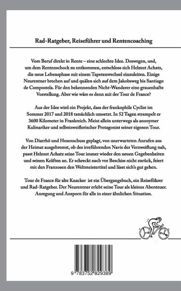 Vom Beruf direkt in Rente ist eine schlechte Idee. Deswegen, und um dem Rentenschock zu entkommen, entschloss sich Helmut Achatz, die neue Lebensphase mit einem Tapetenwechsel einzuleiten. Andere Neurentner brechen auf und quälen sich auf dem Jakobsweg, für den bekennenden Nicht-Wanderer eine grauenhafte Vorstellung. Aber wie wäre es denn mit einer Tour de France? Aus der Idee wird ein Projekt, dass der frankophile Radfan im Sommer 2017 und 2018 tatsächlich umsetzt. In 52 Tagen strampelt er 3500 Kilometer in Frankreich ab. Meist allein unterwegs als anonymer Kulinariker und selbstzweiflerischer Protagonist seiner eigenen Tour. Von Diarrhö und Hexenschuss geplagt, von unerwarteten Anrufen aus der Heimat ausgebremst, ob des irreführenden Navis der Verzweiflung nah, passt Helmut Achatz seine Tour immer wieder den neuen Umständen und seinen Kräften an. Er schreckt auch vor Beschiss nicht zurück, feiert mit den Franzosen den Weltmeistertitel und schlürft Austern im Dutzend. Tour de France für alte Knacker ist Rentnercoaching, Reiseführer und Rad-Ratgeber. Der Neurentner erlebt seine Tour als kleines Abenteuer. Anregung und Ansporn für alle in ähnlicher Situation.