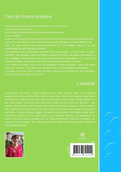 « Sans aucun doute avez-vous entendu parler du Tour de France ? Mais parlons-nous du même ? Vous songez certainement à la grande course de vélo estivale ? Je m¿en doutais ! Le tour de France que je vous propose dans ce recueil n¿est autre qüun périple poétique pour découvrir ou redécouvrir les plus charmantes ou envoûtantes régions de notre belle France. Avec des mots choisis, nous nous promènerons d¿un site magique naturel à un lieu emblématique de nos richesses culturelles. Vous découvrirez les innombrables attraits de notre superbe pays : sa flore insolite, sa faune diversifiée, ses paysages naturels grandioses incluant ses parcs, ses plages magnifiques et ses montagnes majestueuses, mais aussi sa gastronomie extraordinaire, son patrimoine historique fabuleux, ses musées fascinants, hauts lieux de mémoire et de savoir. Vous visiterez la France, éblouis par une multiplicité d¿images poétiques : quels que soient votre âge, vos goûts, vos activités, vos passions, vous y serez inévitablement sensibles. Le voyage s¿annonce exquis et plein de belles surprises qui enchanteront votre perception sensorielle, visuelle, auditive et littéraire. »