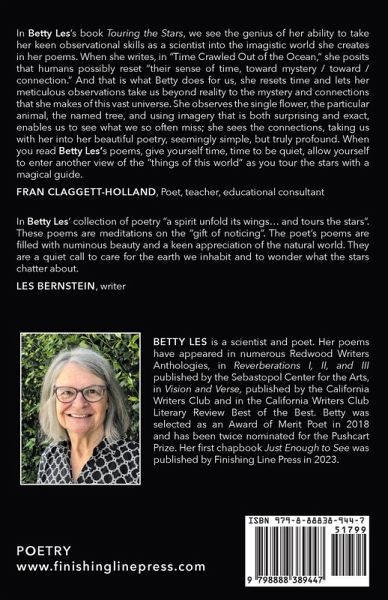 Touring the Stars brings together science, nature, and spirit, using everyday observations and spare form to capture the profound that exists all around us. The author invites readers to step into the miraculous world of nature, opening them to mysteries, insights, and connection. Birds and trees, insects, the nature of time and the consciousness of rocks are familiar themes along with memory, beauty, and loss.