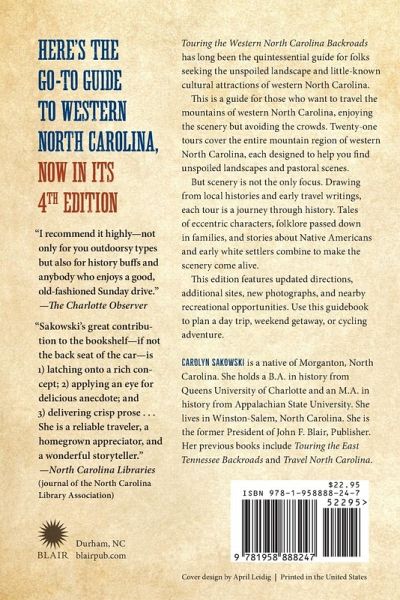 Now in its fourth edition, Touring the Western North Carolina Backroads has long been the go-to guide for folks seeking the unspoiled landscape and little-known cultural attractions of western North Carolina. This is a guide for those who want to travel the mountains of western North Carolina, who want to see the scenery but escape the crowds. The book’s 21 tours cover the entire mountain region of western North Carolina and provide numerous opportunities for seeing unspoiled landscapes and pastoral scenes. But scenery is not the only focus. Once you’re on the backroads, you might speculate about the history behind the old white clapboard farmhouse that dominates the valley ahead, or you might wonder about the rest of the story behind the two sentences on the historical marker at the side of the road. Touring the Western North Carolina Backroads fills in those details. Drawing from local histories and early travel writings, each tour is designed to be a journey through the history of the area. Tales of eccentric characters, folklore that has been passed down through the ages, and stories about Native Americans and early white settlers combine to present a perspective that makes the scenery come alive. This edition features updated directions, additional sites, new photographs, and nearby recreational opportunities. Use this guidebook to plan a day trip, weekend getaway, or cycling adventure.
