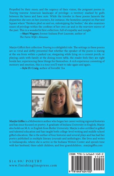 Marjie Giffin's chapbook debut, Touring, traverses the landscape of America, family, and social inequities with observant detail. An encounter with a homeless woman on the steps of a Milwaukee church is just as thought-provoking as the poet's recollection of stepping past shivering homeless persons on the periphery of Harvard. Poignant reflections emerge from both a dusty drive through a ghostly Southwestern village and a middle-aged dip into a pristine Northern lake. A sense of others' entitlement arises when the poet faces restrictions against viewing a New England landscape in "Dead End." Long-ago love is experienced anew in "Back in '73" and heartbreak recounted in "The Potted Plant." A doting mother and grandmother, Giffin writes with obvious devotion to her offspring in poems like "A Place of Peace" and "Grandbaby." Sardonic humor flourishes in her retelling of traveling with adult offspring in "Backseat Rider," while the joy of road-tripping with friends is apparent in "Girls Trip." The title poem, "Touring," takes a step back in time to a favorite card game of Giffin's father, while the collection's ending poem, "Empty City," recreates the eerily quiet atmosphere caused by today's very real experience, the Coronavirus. Poems from Giffin's chapbook have also appeared in Blue Heron Review; Flying Island; Poetry Quarterly; Northwest Indiana Literary Journal; Snapdragon: A Journal of Art and Healing; So It Goes: The Journal of the Kurt Vonnegut Memorial Library, Nos. 6 and 7; St. Katherine Review; The Lives We Live(d) In: An Anthology of Poems about Social Justice; and Tipton Poetry Journal.