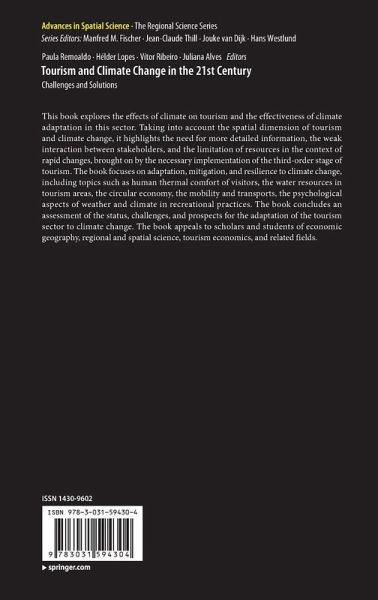 Chapter 1. An introduction to spatial and territorial dimensions of tourism and climate change.- Chapter 2. Challenges and crossroads towards sustainability-oriented tourism facing humanity and its relationship with nature throughout contemporary history.- Chapter 3. A scientific-metric analysis of urban tourism and climate change - an investigation based on Web of Science and Scopus- Chapter 4. Is the tourism perspective envisaged in climate change adaptation planning?.- Chapter 5. Climate change acknowledgement and adaptation and mitigation responses in rural tourism destinations.- Chapter 6. Regional resilience and dependence on tourism in a changing climate.- Chapter 7. Climate change and tourism in Spain. The case of the Canary Islands and the Costa Blanca (Alicante).- Chapter 8. Coastal tourism adaptation to climate change in Brazil.- Chapter 9. A debate on Turkey tourism's adaptation to climate change.- Chapter 10. Conservation-based tourism development, climate change, inclusion of locals, and post-human-wildlife co-existence conflicts.