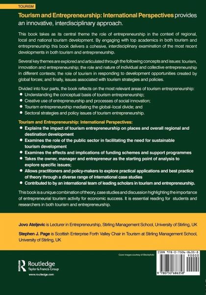 explains the impact of tourism entrepreneurship on places and overall regional and destination developmentexamines the role of the public sector in facilitating the need for sustainable tourism developmentexamines the effects and implications of funding schemes and support programmestakes the owner, manager and entrepreneur as the starting point of analysis to explore specific issuesallows practitioners and policy-makers to explore practical applications and best practice of theory through a diverse range of international case studiescontributed to by an international team of leading scholars in tourism and entrepreneurship