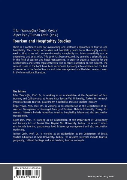 ¿rfan Yaz¿c¿ölu, Prof. Dr., is working as an academician at the Department of Gastronomy and Culinary Arts at Ankara Hac¿ Bayram Veli University, Turkey. His research interests include tourism, gastronomy, hospitality and also tourism industry. Özgür Yayla, Asst. Prof. Dr., is working as an academician at the Department of Recreation Management at Manavgat Faculty of Tourism, Akdeniz University, Turkey. His research interests include recreation, tourism, hospitality, leisure and also destination management. Alper I¿¿n, PhD., is working as an academician at the Department of Gastronomy and Culinary Arts at Ankara Hac¿ Bayram Veli University, Turkey. His research interests include tourism, gastronomy, food & beverage management and also destination marketing. Turhan Çetin, Prof. Dr., is working as an academician at the Department of Social Studies Education at Gazi University, Turkey. His research interests include tourism geography, cultural heritage and also teaching tourism concepts.