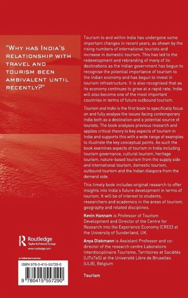Tourism to and within India has undergone some important changes in recent years seen by the rising numbers of international tourists and increase in domestic tourism. This has led to the redevelopment and rebranding of many of its destinations as the Indian government has begun to recognise the potential importance of tourism to the Indian economy and has begun to invest in tourism infrastructure. It is also recognised that as its economy continues to grow at a rapid rate, India will also become one of the most important countries in terms of future outbound tourism. Tourism and India is the first book to specifically focus on and fully analyze the issues facing contemporary India both as a destination and a potential source of tourists. The book analyses previous research and applies critical theory to key aspects of tourism in this region and supports this with a wide range of examples to illustrate the key conceptual points. As such the book examines aspects of tourism in India including tourism governance, cultural tourism, heritage tourism, nature-based tourism from the supply side and international tourism, domestic tourism, outbound tourism and the Indian Diaspora from the demand side. This timely book includes original research to offer insights into India's future development in terms of tourism. It will be of interest to students, researchers and academics in the areas of Tourism, Geography and related disciplines.