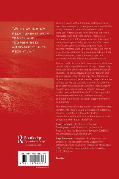 Tourism to and within India has undergone some important changes in recent years seen by the rising numbers of international tourists and increase in domestic tourism. This has led to the redevelopment and rebranding of many of its destinations as the Indian government has begun to recognise the potential importance of tourism to the Indian economy and has begun to invest in tourism infrastructure. It is also recognised that as its economy continues to grow at a rapid rate, India will also become one of the most important countries in terms of future outbound tourism. Tourism and India is the first book to specifically focus on and fully analyze the issues facing contemporary India both as a destination and a potential source of tourists. The book analyses previous research and applies critical theory to key aspects of tourism in this region and supports this with a wide range of examples to illustrate the key conceptual points. As such the book examines aspects of tourism in India including tourism governance, cultural tourism, heritage tourism, nature-based tourism from the supply side and international tourism, domestic tourism, outbound tourism and the Indian Diaspora from the demand side. This timely book includes original research to offer insights into India's future development in terms of tourism. It will be of interest to students, researchers and academics in the areas of Tourism, Geography and related disciplines.