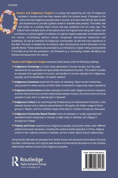 Tourism and Indigenous Peoples is a unique text examining the role of indigenous societies in tourism and how they interact within the tourism nexus. Unlike other publications, this text focuses on the active role that indigenous peoples take in the industry, and uses international case studies and experiences to provide a global context to illustrate best practice and aid comparison. First published over ten years ago the editors, Butler and Hinch, have thoroughly revised and updated the text to bring together a new collection of contributions and case studies from recognised international authors and those with first hand experiences in this area. Divided into five main sections, the text looks at this topic under the following headings: * Involvement: Uses case studies to discuss and compare such as 'campfire' programmes in east Africa, and the employment of indigenous peoples as guides, amongst other cases,* Turbulence: Host guest relationships, conflicts on communities and contrasting strategies and results of tourism in indigenous villages in South Africa* Issues: Discusses issues such as authenticity, religious beliefs and managing indigenous tourism in a fragile environment* Progress: Looks at tourism education, tourism and cultural survival and examples of the policy and practice of indigenous tourism.* Conclusions: Five contributions from indigenous people on North America, Australasia and Europe to discuss implications and experiences.Each section uses international case studies from, for example, Australia, New Zealand, Nepal, Namibia, Thailand, Saudi Arabia and South America.