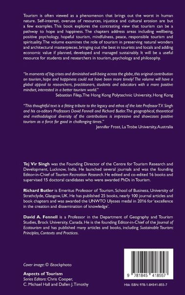 This book explores the view that tourism can be a pathway to hope and happiness. It examines the role of tourism in preserving natural and architectural wonders, bringing out the best in tourists and locals and adding economic value if managed sustainably. It is a useful resource for students and researchers in tourism, psychology and philosophy.