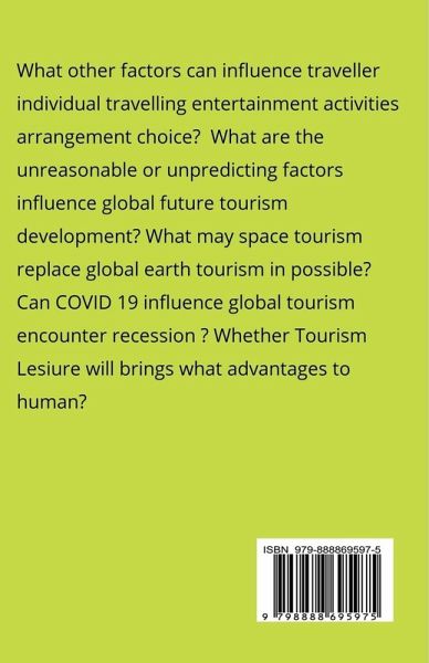 Nowadays, global travelling entertainment activities are popular. Some travellers like domestic travelling or some travellers like to catch airplanes to go to other countries travel. In consumer behavioral view point, when the consumer discovers the product's price is higher than the another product's price. Then, he/she will usually to choose to buy the cheaper product, such as travel agent travelling entertainment activities arrangement service case, whether the travelling provider charges higher travelling entertainment activities arrangement service fee to compare the another similar travelling entertainment activities arrangement service provider. Does this travelling entertainment activities similar fee comparison factor influence any travellers choose to find the cheaper travelling entertainment activities arrangement provider? If travelling entertainment activities arrangement price is not the main factor to influence traveller individual choice. What other factors can influence traveller individual travelling entertainment activities arrangement choice? What are the unreasonable or unpredicting factors influence global future tourism development? What may space tourism replace global earth tourism in possible? Can COVID 19 influence global tourism encounter recession ? Whether Tourism Lesiure will brings what advantages to human?