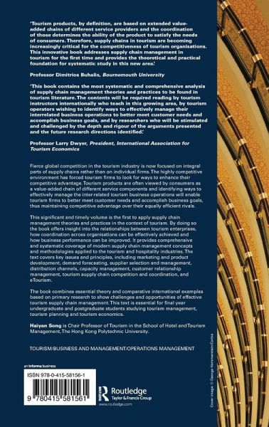 Fierce global competition in the tourism industry is now focused on integral parts of supply chains rather than on individual firms. The highly competitive environment has forced tourism firms to look for ways to enhance their competitive advantage. Tourism products are often viewed by consumers as a value-added chain of different service components and identifying ways to effectively manage the interrelated tourism business operations will enable tourism firms to better meet customer needs and accomplish business goals thus maintaining competitive advantage over their equally efficient rivals. This significant and timely volume is the first to apply supply chain management theories and practices in the context of tourism. By doing so the book offers insight into the relationships between tourism enterprises, how coordination across organizations can be effectively achieved and how business performance can be improved. It provides comprehensive and systematic coverage of modern supply chain management concepts and methodologies applied to the tourism and hospitality industries. The text covers key issues and principles including: marketing and product development, demand forecasting, supplier selection and management, distribution channels, capacity management, customer relationship management, tourism supply chain competition and coordination, and e-tourism. The book combines essential theory and comparative international examples based on primary research to show challenges and opportunities of effective tourism supply chain management. This text is essential for final year undergraduate and postgraduate students studying Tourism Management, Tourism Planning and Tourism Economics.