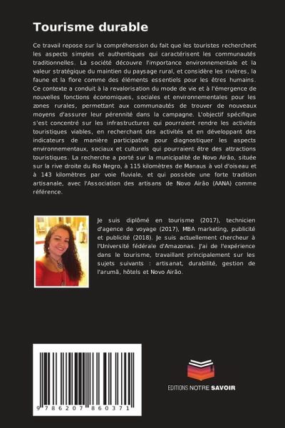 Ce travail repose sur la compréhension du fait que les touristes recherchent les aspects simples et authentiques qui caractérisent les communautés traditionnelles. La société découvre l'importance environnementale et la valeur stratégique du maintien du paysage rural, et considère les rivières, la faune et la flore comme des éléments essentiels pour les êtres humains. Ce contexte a conduit à la revalorisation du mode de vie et à l'émergence de nouvelles fonctions économiques, sociales et environnementales pour les zones rurales, permettant aux communautés de trouver de nouveaux moyens d'assurer leur pérennité dans la campagne. L'objectif spécifique s'est concentré sur les infrastructures qui pourraient rendre les activités touristiques viables, en recherchant des activités et en développant des indicateurs de manière participative pour diagnostiquer les aspects environnementaux, sociaux et culturels qui pourraient être des attractions touristiques. La recherche a porté sur la municipalité de Novo Airão, située sur la rive droite du Rio Negro, à 115 kilomètres de Manaus à vol d'oiseau et à 143 kilomètres par voie fluviale, et qui possède une forte tradition artisanale, avec l'Association des artisans de Novo Airão (AANA) comme référence.