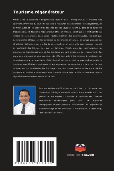 *Au-delà de la durabilité : Regenerative Tourism for a Thriving Planet "* présente une approche innovante du tourisme qui vise à restaurer et à régénérer les écosystèmes, les communautés et les économies touchés par les voyages. Allant au-delà de la durabilité traditionnelle, le tourisme régénérateur offre un modèle holistique et multipartite qui intègre la restauration écologique, l'autonomisation des communautés, les pratiques commerciales éthiques et les principes de l'économie circulaire. L'ouvrage propose des stratégies réalisables, des études de cas mondiales et des outils pour mesurer l'impact, en explorant des thèmes tels que la résilience, l'implication des communautés, les expériences transformatrices et les touristes en tant qu'agents du changement. Des exercices pratiques et des questions de réflexion aident les lecteurs à appliquer ces connaissances à des contextes réels. Destiné aux universitaires, aux professionnels du tourisme, aux décideurs politiques et aux voyageurs responsables, ce livre met l'accent non plus sur la minimisation des dommages, mais sur la contribution active à une planète prospère et résiliente, établissant une nouvelle norme pour le rôle du tourisme dans la régénération environnementale et sociale.