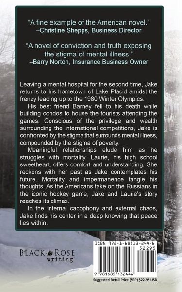 Leaving a mental hospital for the second time, Jake returns to his hometown of Lake Placid amidst the frenzy leading up to the 1980 Winter Olympics. His best friend Barney fell to his death while building condos to house the tourists attending the games. Conscious of the privilege and wealth surrounding the international competitions, Jake is confronted by the stigma that surrounds mental illness, compounded by the stigma of poverty. Meaningful relationships elude him as he struggles with mortality. Laurie, his high school sweetheart, offers comfort and understanding. She reckons with her past as Jake contemplates his future. Mortality and impermanence tangle his thoughts. As the Americans take on the Russians in the iconic hockey game, Jake and Laurie's story reaches its climax. In the internal cacophony and external chaos, Jake finds his center in a deep knowing that peace lies within.