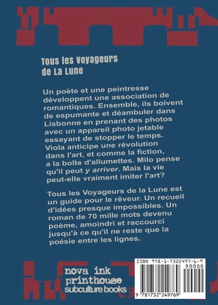 UN POÈTE ET UNE PEINTRESSE DÉVELOPPENT une association de romantiques. Ensemble, ils boivent du champagne et se promènent autour de Lisbonne en prenant des photos avec un appareil photo jetable en essayant d'arrêter le temps. Viola anticipe une révolution dans l'art, et comme la fiction, a la boîte des allumettes. Milo pense qu'il peut faire en sorte que cela se produise. Mais la vie peut-elle vraiment imiter l'art?TOUS LES VOYAGEURS DE LA LUNE est un guide moderne pour le rêveur moderne. Un recueil d'idées enivrées, emballés comme des sardines en conserve. Un roman de 74 mille mots tourné poème, diminué et raccourci jusqu'à ce qu'il ne reste que la poésie entre les lignes. A POET AND A PAINTER DEVELOP 'an association of romantics.' Together they drink Espumante and amble round Lisbon taking pictures with a disposable camera trying to "stop time." Viola anticipates a revolution in art, and like fiction, has the box of matches. Milo thinks he can "make it happen." But can life really imitate art?ALL THE MOON TRAVELLERS is a modern day guide book for the modern day dreamer. A compendium of intoxicated ideas, packed in like canned sardines. A 74 thousand word novel turned poem, lessened and shortened 'till all that is left is the poetry between the lines.