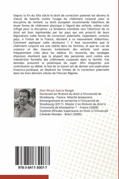 Depuis la fin du XXe siècle le droit de correction paternel est devenu le cheval de bataille contre l'usage du châtiment corporel pour la discipline de l'enfant. Le droit européen recommande l'abolition de toute forme de châtiment physique à l'égard des enfants, même celui infligé pour la discipline. La tendance mondiale vers l'abolition de ce droit est bien représentée par les pays qui ont proscrit de leurs législations cette forme de correction paternelle. Cependant, certains pays, à l'instar de la France, résistent à ce mouvement d'abolition. Comment expliquer cette résistance ? Il faut reconnaître que le châtiment corporel est une réalité dans les familles, et que les cas de violence et des mauvais traitements des enfants sont assez fréquemment cités dans les médias. En revanche, des sondages d'opinion montrent que la plupart des personnes sont contre une interdiction formelle des châtiments corporels dans la famille. Ces données prouvent la polémique du sujet. Afin d'apporter une contribution au débat, le but de ce travail est de donner une explication historico-juridique, en étudiant les limites de la correction paternelle dans les trois derniers siècles de l'Ancien Régime.