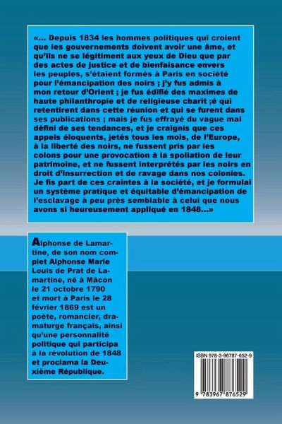 ... Depuis 1834 les hommes politiques qui croient que les gouvernements doivent avoir une âme, et qu'ils ne se légitiment aux yeux de Dieu que par des actes de justice et de bienfaisance envers les peuples, s'étaient formés à Paris en société pour l'émancipation des noirs ; j'y fus admis à mon retour d'Orient ; je fus édifié des maximes de haute philanthropie et de religieuse charit ;é qui retentirent dans cette réunion et qui se furent dans ses publications ; mais je fus effrayé du vague mal défini de ses tendances, et je craignis que ces appels éloquents, jetés tous les mois, de l'Europe, à la liberté des noirs, ne fussent pris par les colons pour une provocation à la spoliation de leur patrimoine, et ne fussent interprétés par les noirs en droit d'insurrection et de ravage dans nos colonies. Je fis part de ces craintes à la société, et je formulai un système pratique et équitable d'émancipation de l'esclavage à peu près semblable à celui que nous avons si heureusement appliqué en 1848...