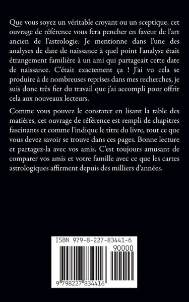 Que vous soyez un véritable croyant ou un sceptique, cet ouvrage de référence vous fera pencher en faveur de l'art ancien de l'astrologie. Je mentionne dans l'une des analyses de date de naissance à quel point l'analyse était étrangement familière à un ami qui partageait cette date de naissance. C'était exactement ça ! J'ai vu cela se produire à de nombreuses reprises dans mes recherches, je suis donc très fier du travail que j'ai accompli pour offrir cela aux nouveaux lecteurs. Comme vous pouvez le constater en lisant la table des matières, cet ouvrage de référence est rempli de chapitres fascinants et comme l'indique le titre du livre, tout ce que vous devez savoir se trouve dans ces pages. Bonne lecture et partagez-la avec vos amis. C'est toujours amusant de comparer vos amis et votre famille avec ce que les cartes astrologiques affirment depuis des milliers d'années.