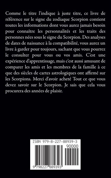 Comme le titre l'indique à juste titre, ce livre de référence sur le signe du zodiaque Scorpion contient toutes les informations dont vous aurez jamais besoin pour connaître les personnalités et les traits des personnes nées sous le signe du Scorpion. Des analyses de dates de naissance à la compatibilité, vous aurez un livre à garder pour toujours, sachant que vous pourrez le consulter pour vous ou vos amis. C'est une expérience d'apprentissage, mais c'est aussi amusant de comparer les amis et les membres de la famille à ce que des siècles de cartes astrologiques ont affirmé sur les Scorpions. Merci d'avoir acheté Tout ce que vous devez savoir sur le Scorpion. Je sais que cela vous procurera des années de plaisir.